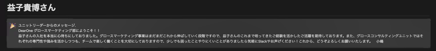 あと、個人的にとてもうれしかったのは、一人ひとりに対してリーダーからのメッセージが贈られることです。入社初日にオンボーディングクエストのトップ画面でリーダーからの期待のメッセージを見た時には、歓迎されていると感じて感激しました。