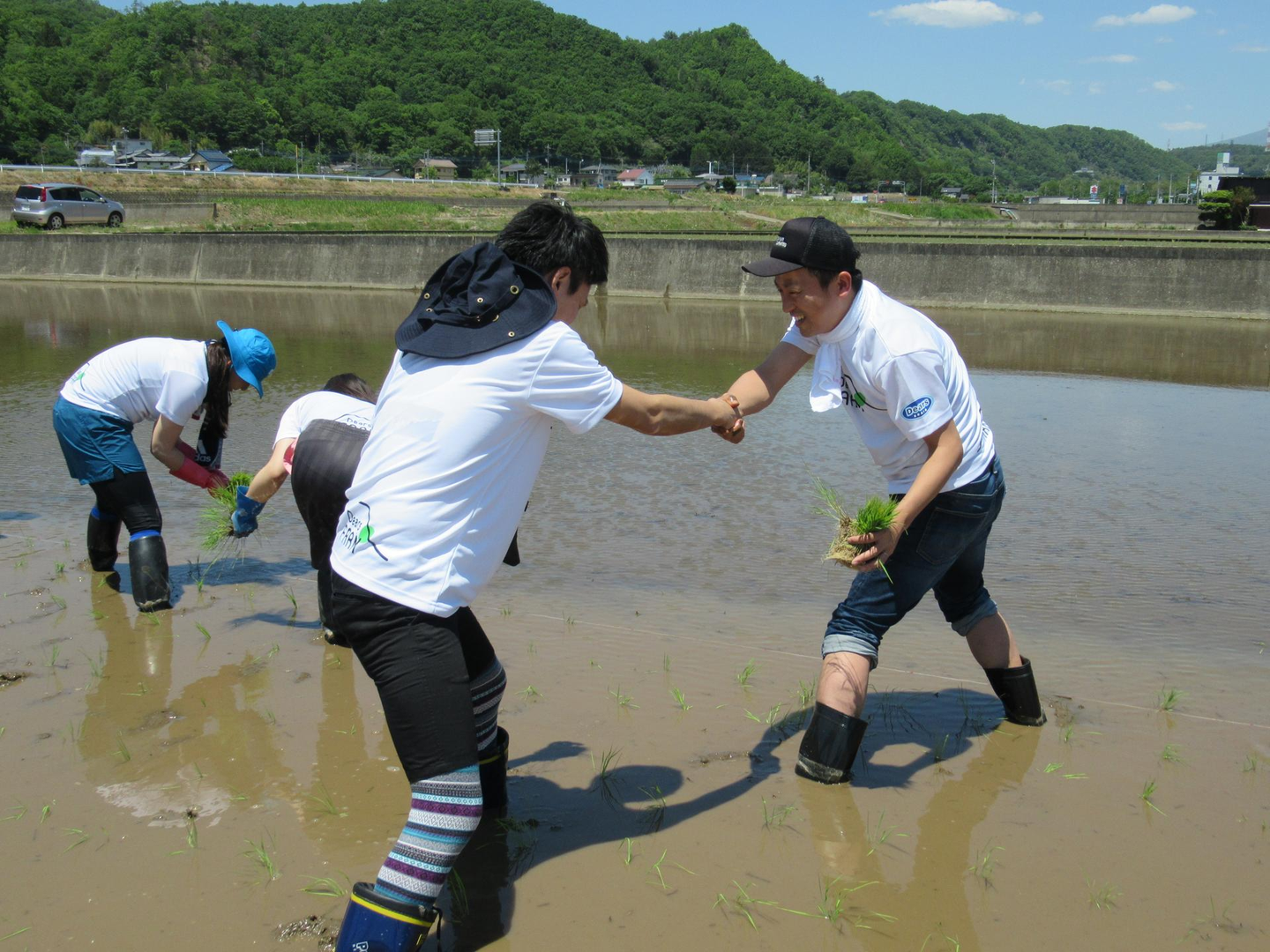 長靴で田んぼに入る経験すら初めてのメンバーが多いため、みな最初は泥に足を取られそうになりながらも、それ自体がとても楽しそうです。苗代を持ち、目安になる印のついた紐の横に植えていくのですが、数十分ほどで手植えにも慣れ、どんどんとスピードアップ!大人数での作業ということもあり1時間ほどで畑一面に苗を植えることができました。