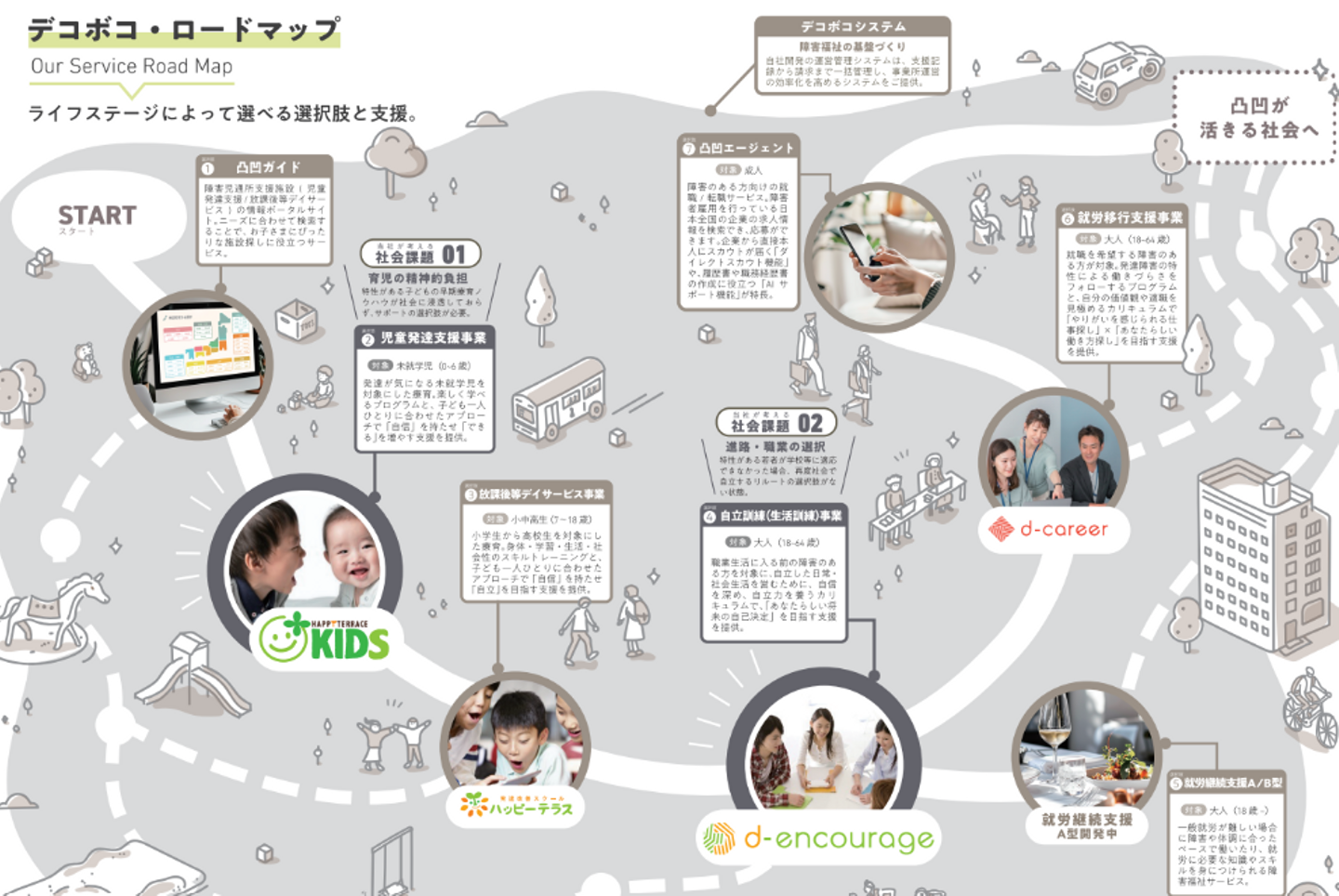 デコボコベース株式会社は、「凸凹が活きる社会を創る。」という壮大なビジョンと、「教育と福祉で、ゆたかさを広める。」という企業理念を掲げ、「明るく・楽しく・元気よくそして仲良く~共によい会社を創りましょう~」という社是のもと、主に発達障害のある方々への就労支援と発達支援を中心に、多様なサービスを提供している会社です。