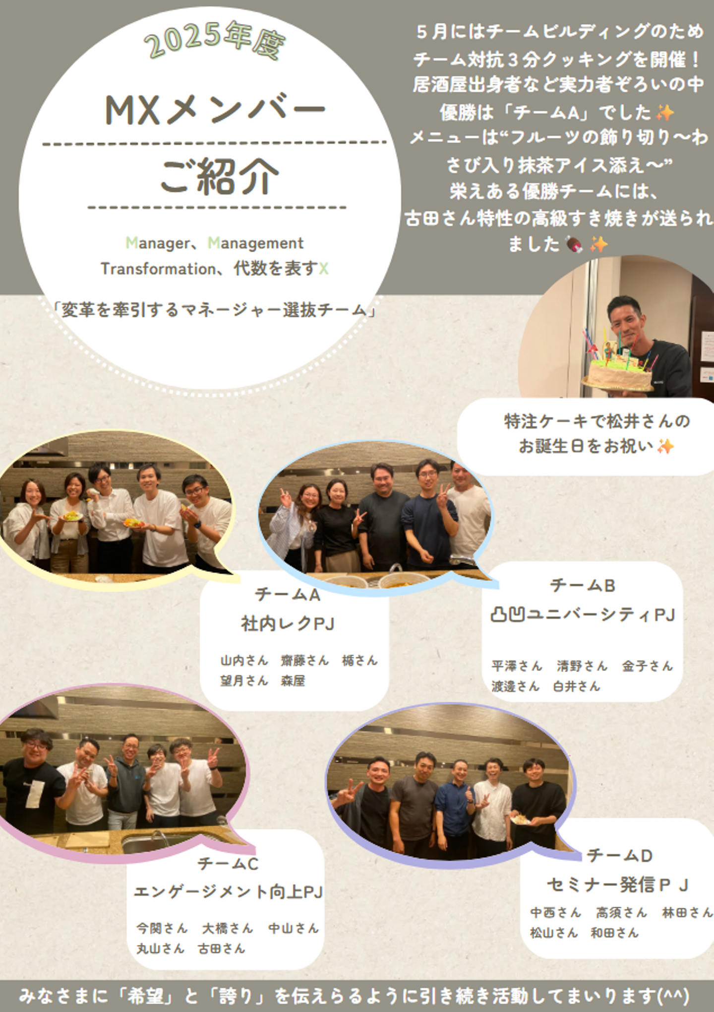 MXメンバーは日々の業務と並行して、経営視点を学ぶ実践的な取り組みにチャレンジします!