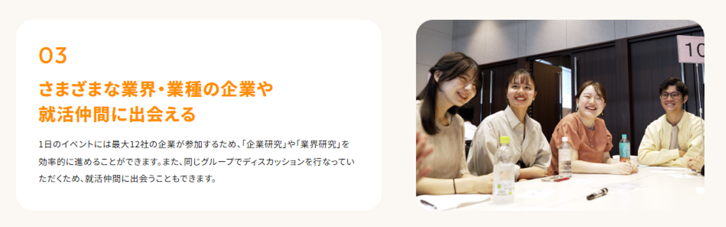 6名前後が1チームとなるため、イベント終了後には連絡先を交換し、今後の就活仲間を広げることも可能です。これは対面のイベントだからこそのメリットです。