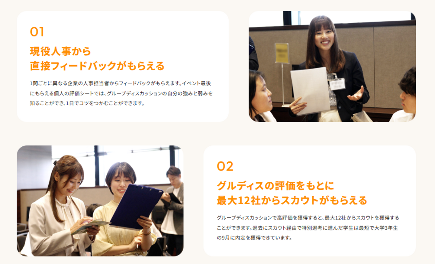 当社サービスでは企業がグループディスカッションを通じて学生を見極め、直接スカウトできる対面形式の新卒採用イベントを運営しております。