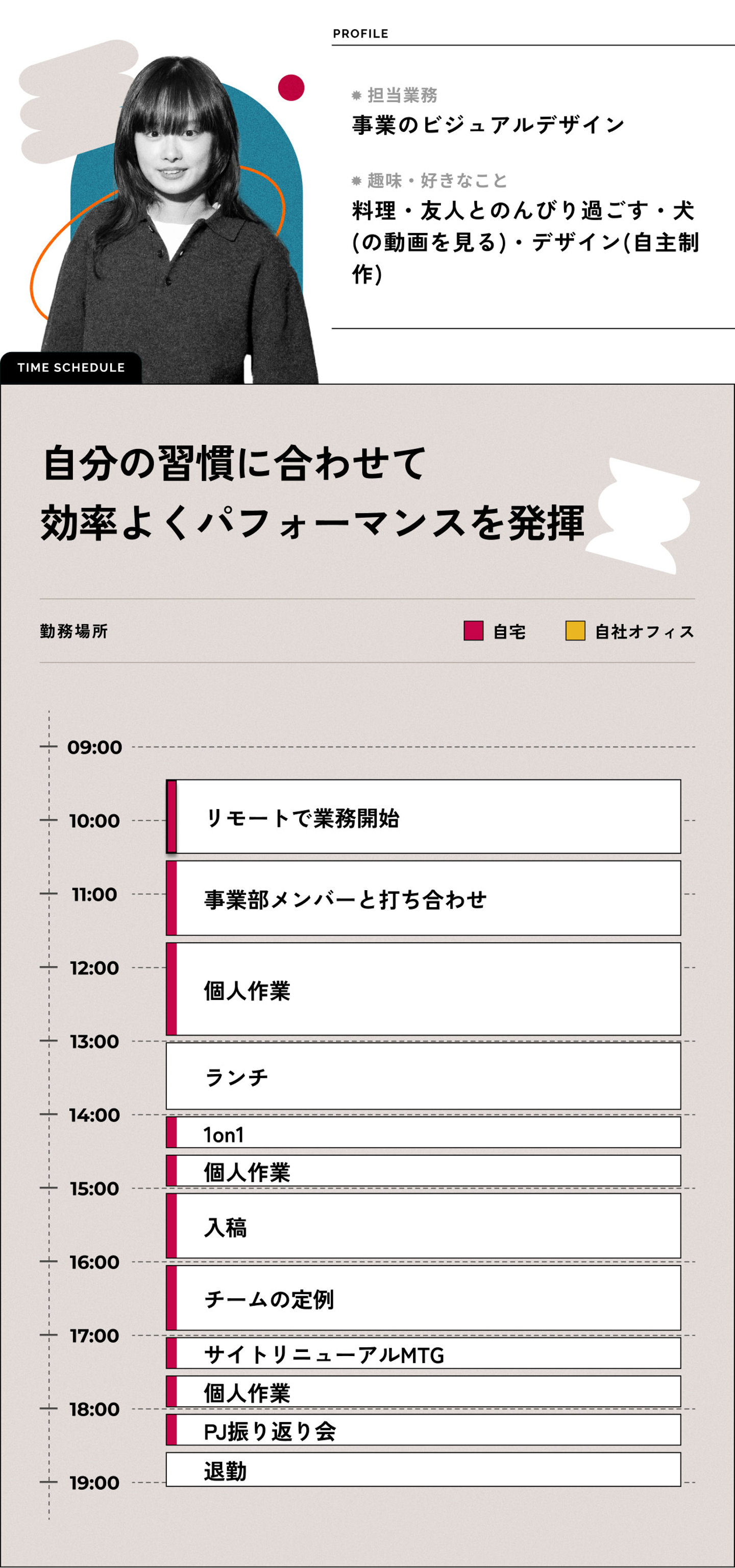 仕事とプライベート、作業とミーティングの時間の切り替えを柔軟に、自分の裁量でコントロールできるので働きやすいです。現在のチームでは、ミーティングが毎週火曜と木曜にまとめられているため週のプランニングで作業時間をしっかり確保できますし、スーパーフレックス制度の導入でミーティング以外は自由に働く時間を決められるので、通院や家族との時間も調整しやすいのが嬉しいです。