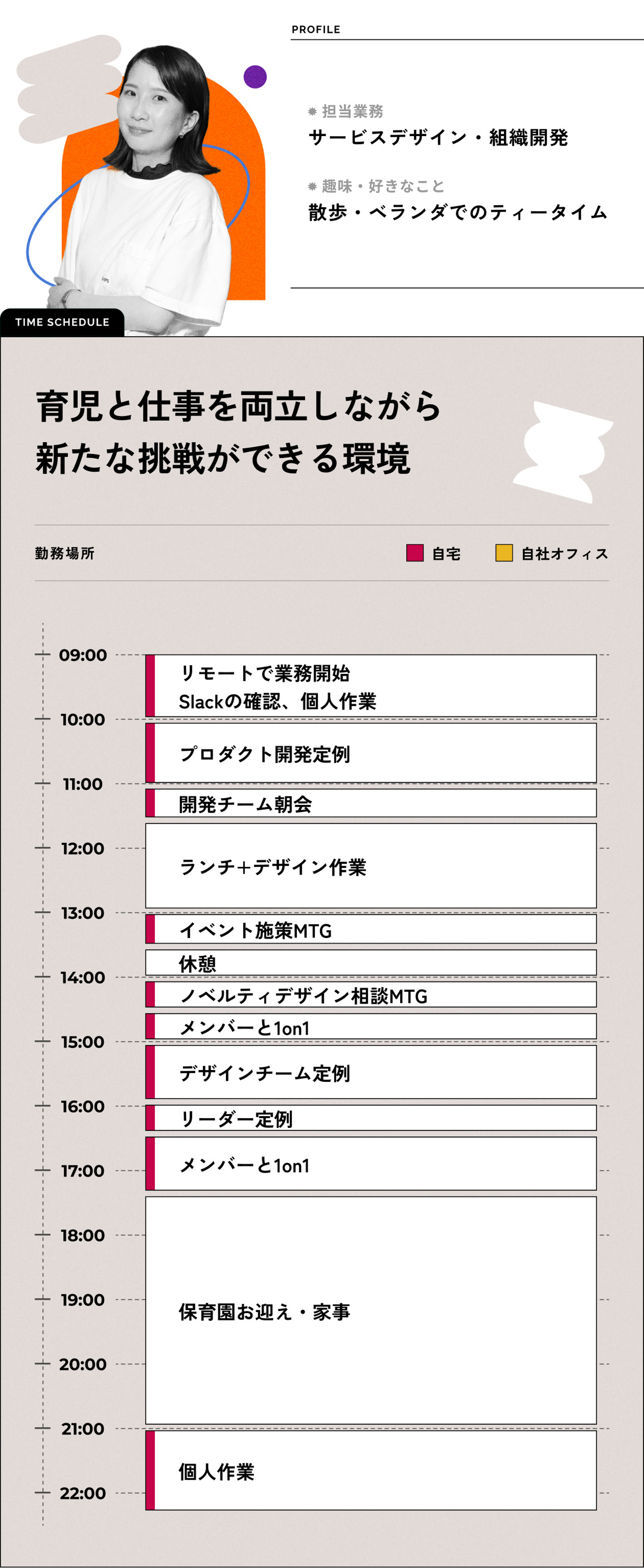 この日は9:00に業務開始。Slackの連絡などを確認した後は、小刻みなスケジュールで開発チームとの朝会や定例、イベント施策のミーティングなど、多忙なスケジュールをこなしながら、その間でデザイン作業やメンバーとの1on1などを行いました。保育園のお迎え時間の前までにミーティングはすべて実施し、いったん業務終了。家族のことを済ませた後、個人の作業時間を確保しているのがわかります。リモートワークとスーパーフレックス制度を活かして、自分のペースで働ける環境づくりをしているようです。