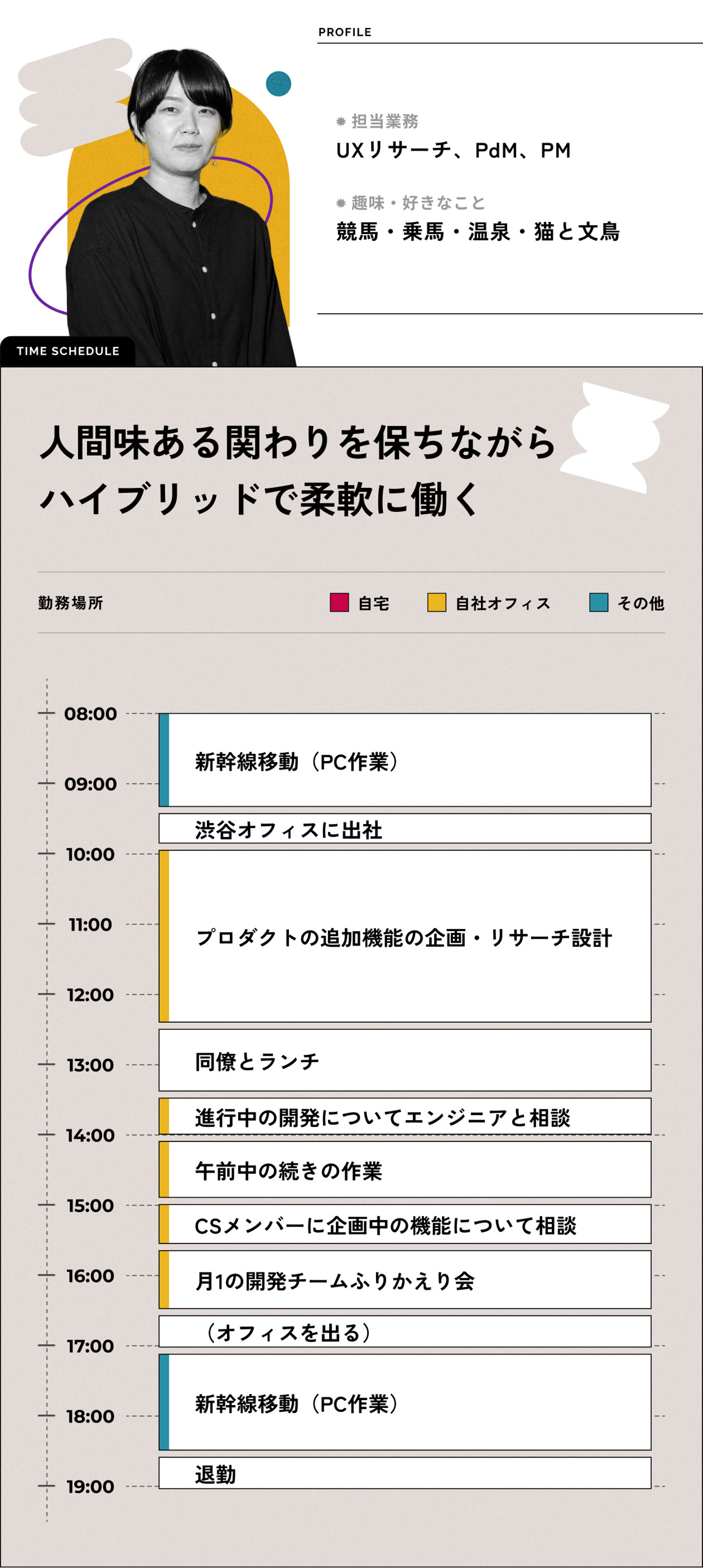 東京から長野に移住し、普段はリモートワークでの勤務ですが、この日は渋谷オフィスに出社。新幹線での移動時間を作業に当て、オフィスに到着後、10:00からプロダクトの追加機能についての企画・リサーチ設計の個人作業を進めました。午後は、出社しているエンジニアと進行中の開発について相談したり、CSメンバーに企画中の機能について相談したり、また夕方は開発チームのふりかえり会を実施するなど、メンバーとの対面でのミーティングを中心に1日を過ごしました。退勤後の新幹線移動中も作業時間としてキープするなど時間を有効活用しているようです。