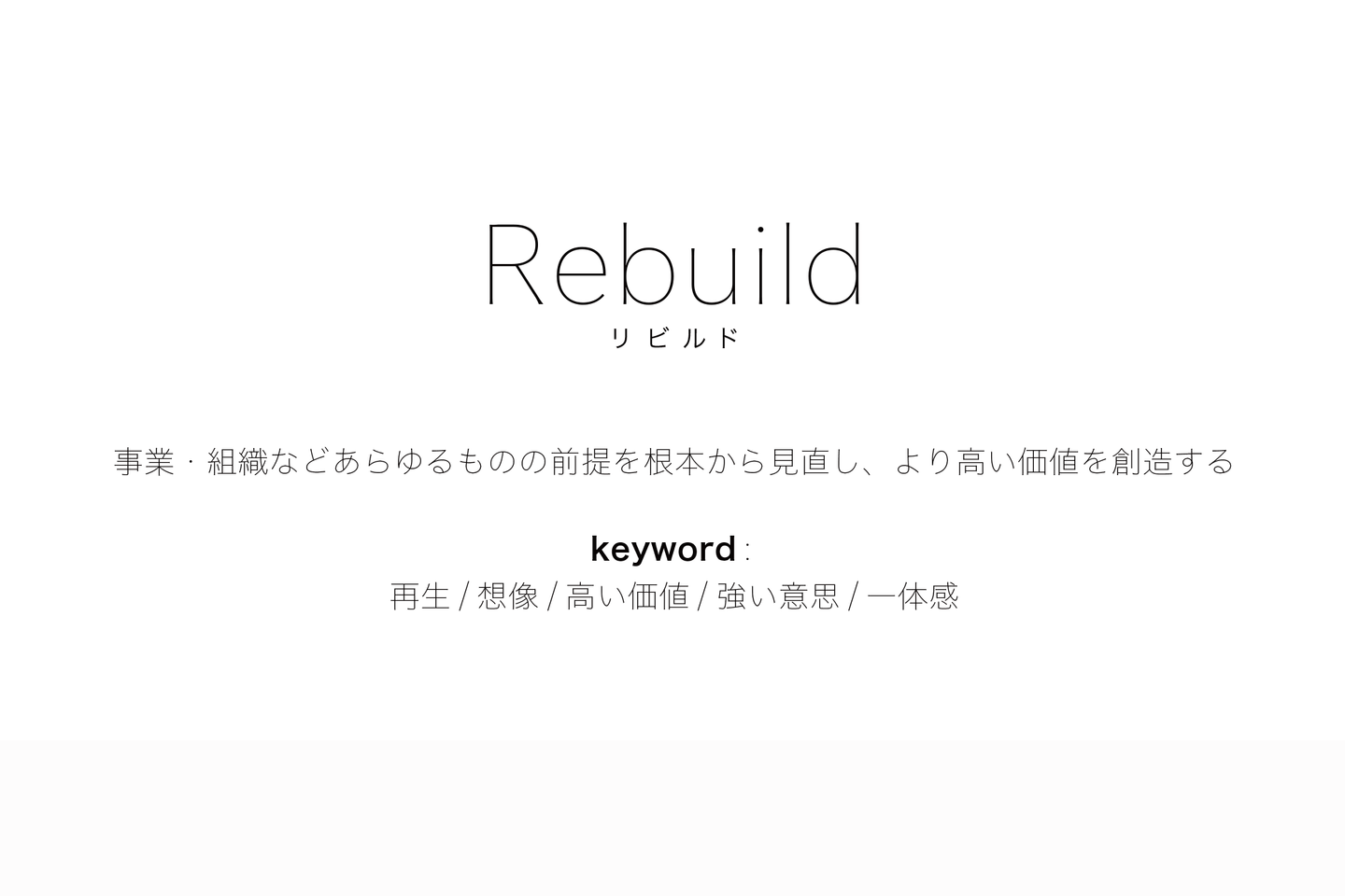 行動指針として「REBUILD」という言葉を作りましたが、この言葉と意味付けした一文(事業・組織などあらゆるものの前提を根本から見直し、より高い価値を創造する)だけでは、捉え方はメンバーそれぞれによって違ってしまうと思ったんです。ですので、少なくとも捉えてもらう方向性は合わせていきたいという背景がありました。