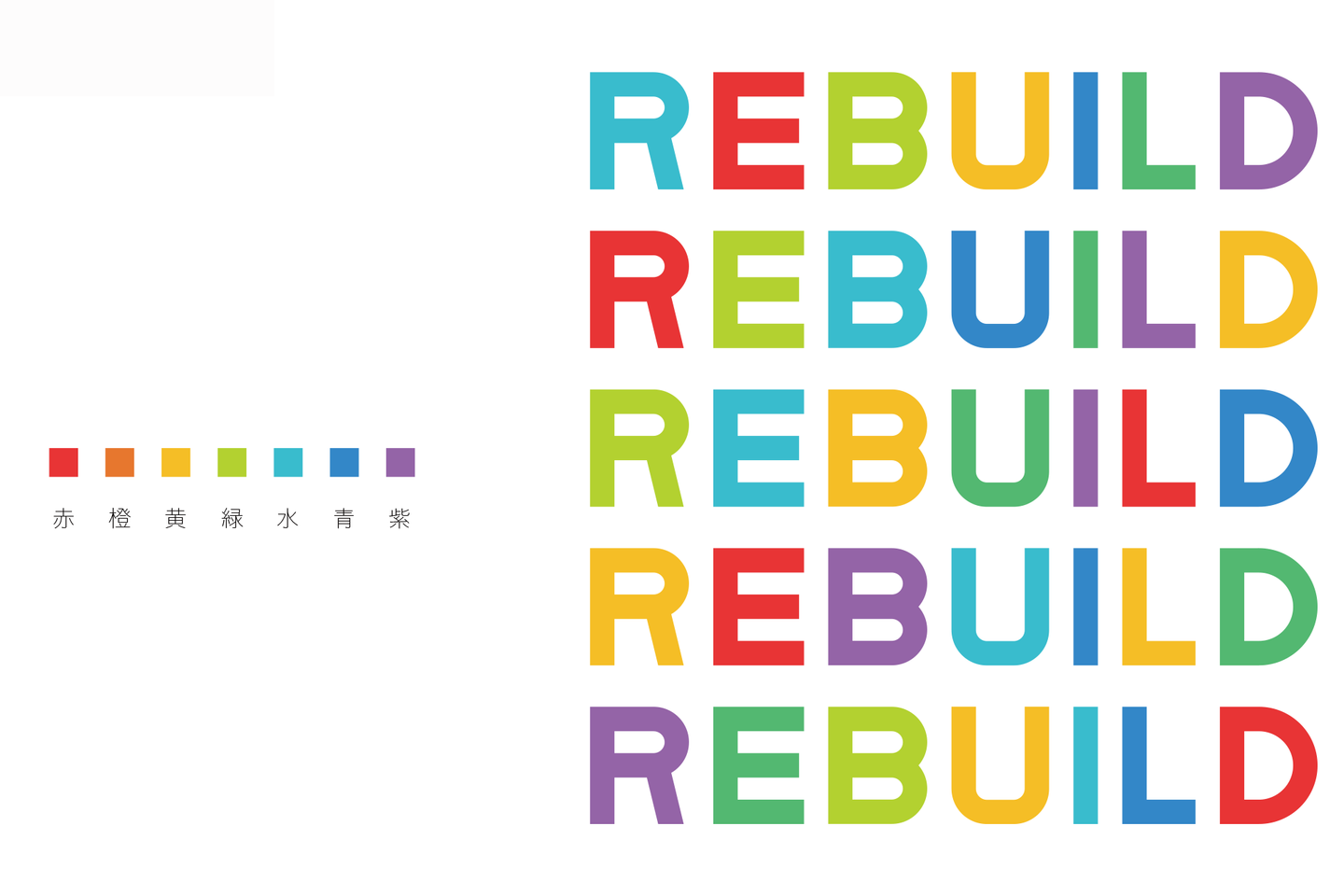 色の並びなんですが、キレイにグラデーションさせた方が人は見やすかったり安心感があると思うんです。ですが、あえて色の並びをバラしました。パッと見たときにREBUILDって読み辛くなるんですが、バラした方が1個1個の文字に目が止まって、結果、REBUILDという言葉が頭の中に残るかなと。