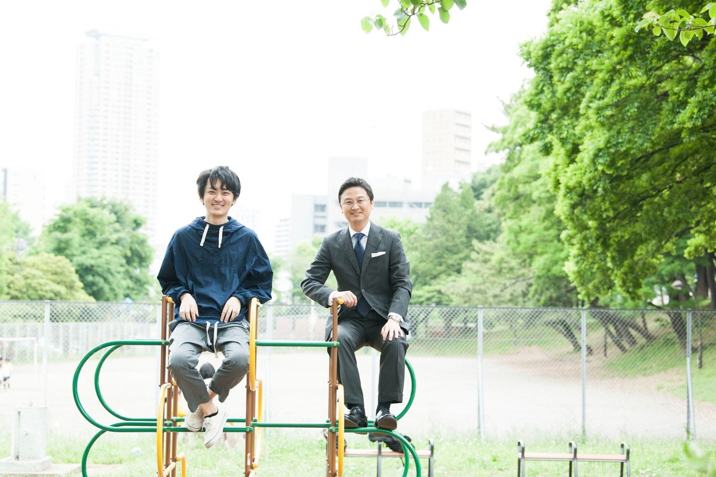 創業1年後の2017年に撮影したCTO水上とCEO山本のツーショット。都会に息子を送り出す親子のよう