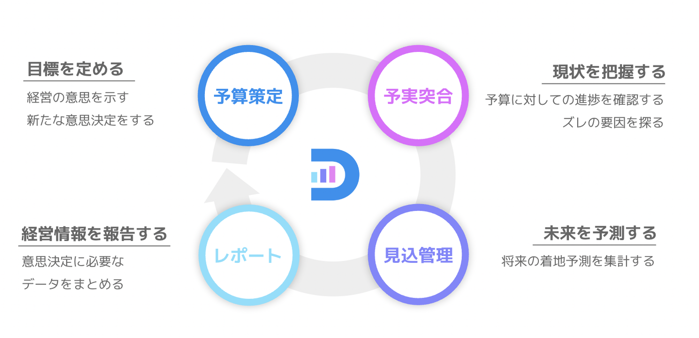 予実管理業務は大きく下記の4つの機能でできています。DIGGLEは予実管理業務をワンストップで提供し、脱エクセル/スプレッドシートを実現します。