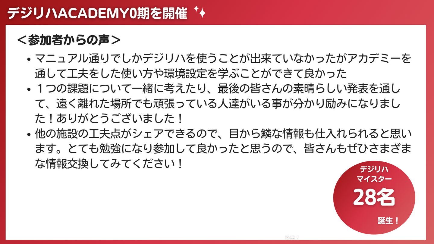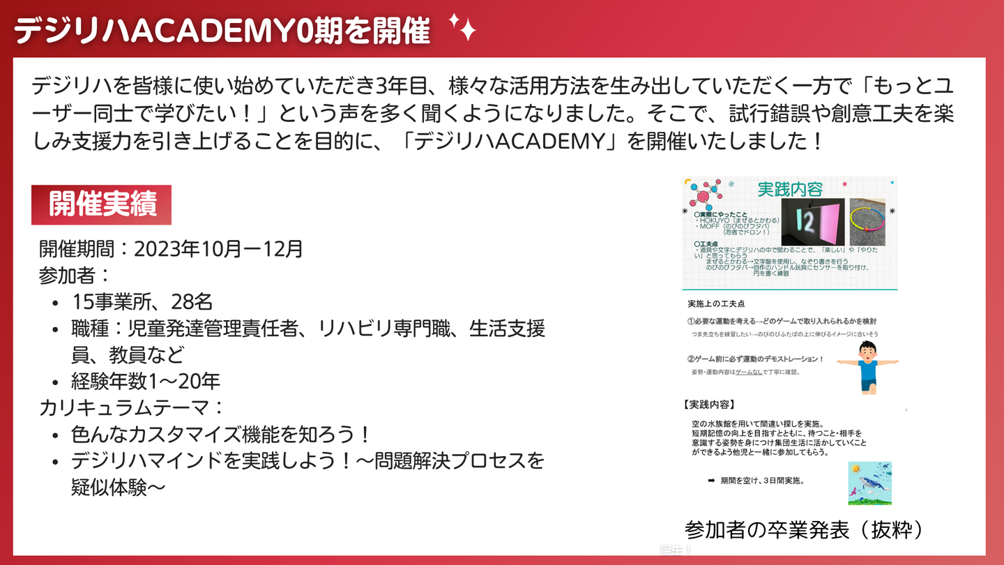 その1つとして、デジリハを初めて使うよ!というビギナーの方もデジリハの基礎と応用的な考え方、創意工夫のコツを身に着けられるカリキュラムとして「デジリハACADEMY」を行っています。2023年10月~12月、さきがけである0期生のカリキュラムを開催しました。