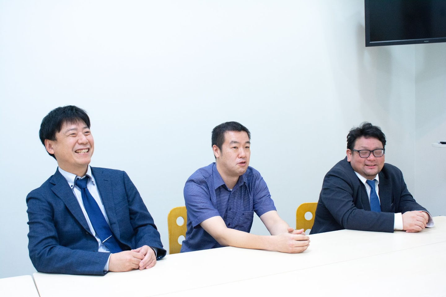そんなデジタル・ナレッジでは、お客様視点を大切にし、職種の垣根を越えて皆で共創し合ってプロジェクトを進めています。そこで今回は、コーディネータリーダーを務める猪伏 智彦さん、エンジニアリーダーを務める佐藤 竜太さん、ディレクタリーダーを務める平嵜 博也さんの3人に、デジタル・ナレッジにおけるプロジェクトの進め方についてお話を伺いました。