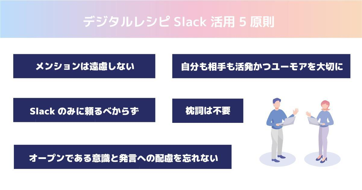 日常のコミュニケーションでは、Slackを活用しておりデジタルレシピでは、みんなが集まるオフィスのような存在です。そんなSlackの運用にも、働きやすさを目指したいくつかの工夫があります。