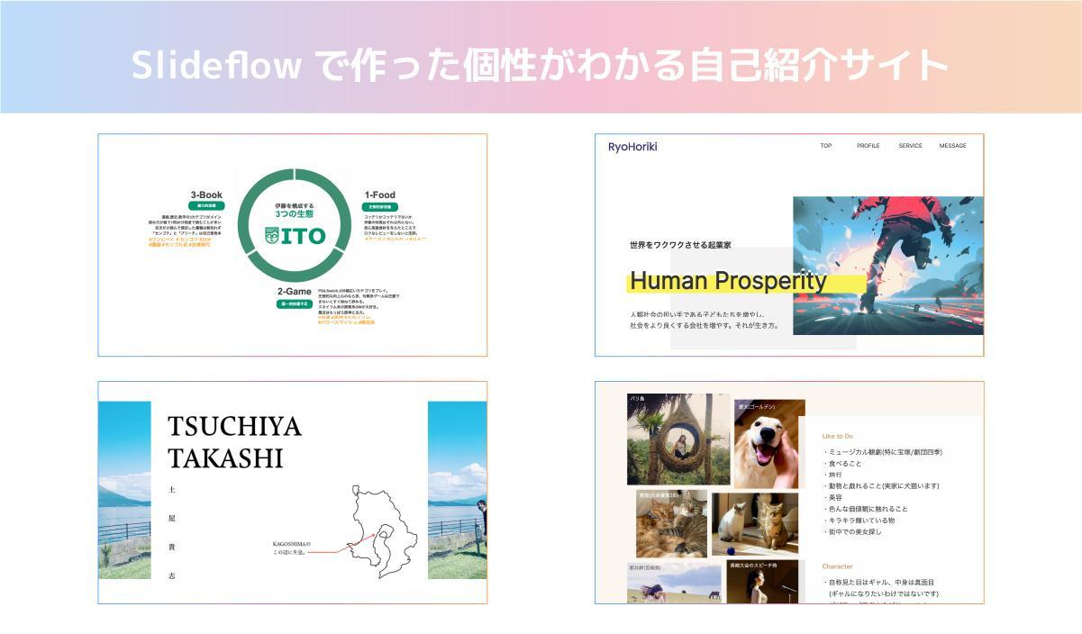 実際に、サービスを使ってみることでサービスへの理解を深めるだけでなく、Slideflowではいつも使い慣れているパワポを使うことで構成や、デザインなども自由に表現ができそれぞれ個性が出るサイトが出来上がります。