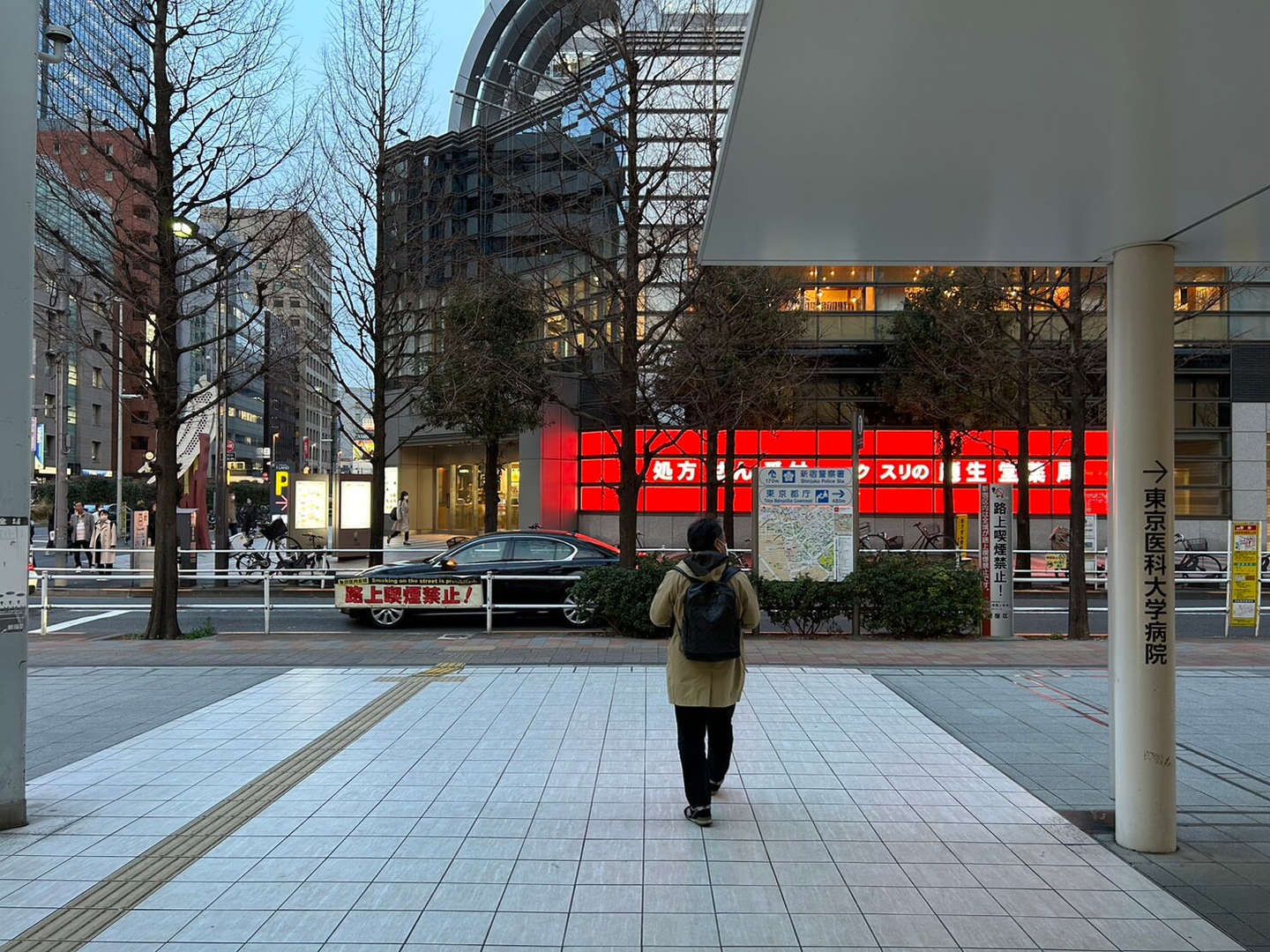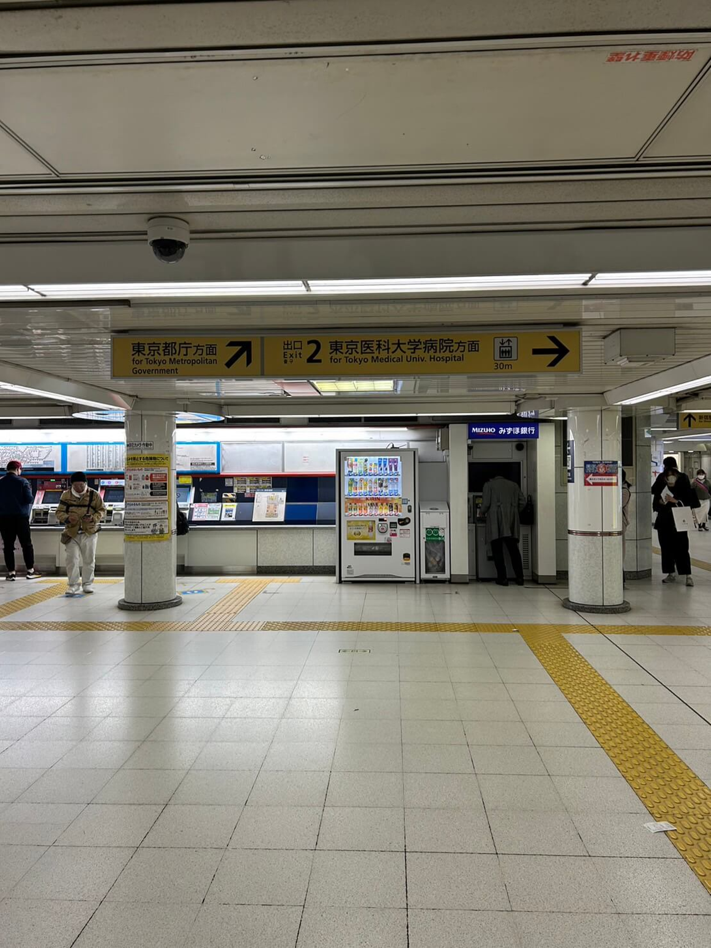 ①、改札を出たら出口2「東京医科大学病院方面」から地上に出ます。