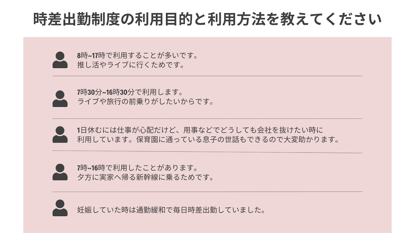 テスト的に社内の育児中の皆さんに導入した結果、利用者が1人のみであったため制度化が見送られました。※今後再検討する可能性はあるとのこと