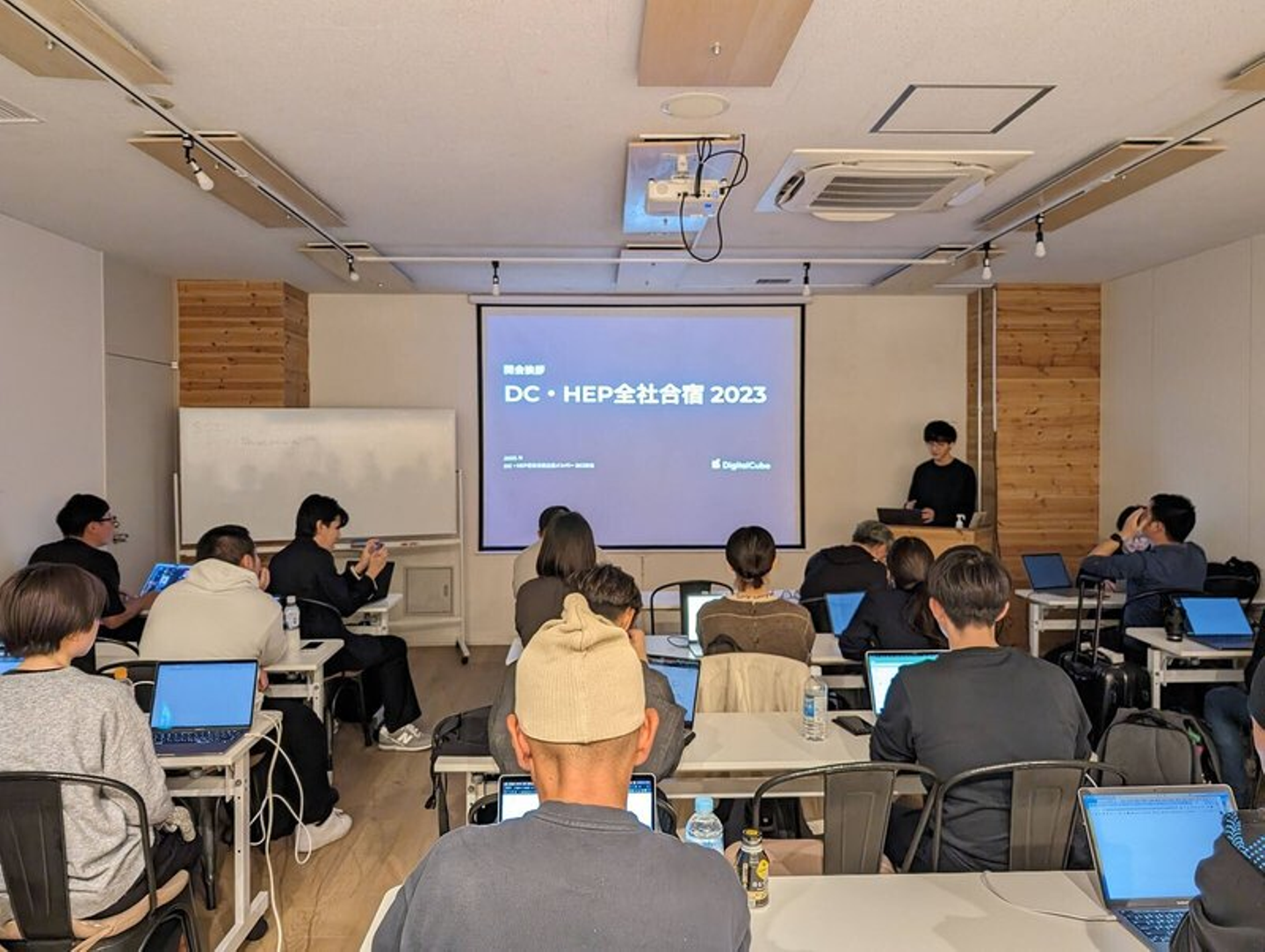 まずは全社合宿です。全社合宿はグループ会社であるヘプタゴンも含め、デジタルキューブグループのメンバーが一堂に会する機会です。昨年11月に行われた全社合宿では経営陣からの方針発表、部門ごとの発表や分科会も行われました。