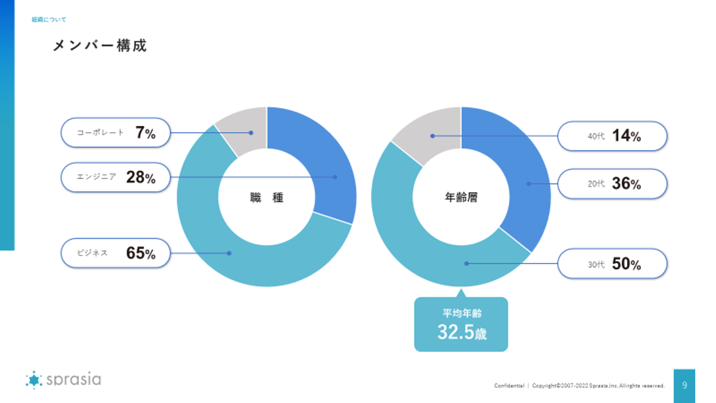 現在スプラシアに所属している社員は役員含め27名です。部署はビジネスサイド、エンジニアサイド、そしてバックオフィスと3つに分かれており、男女比は6:4くらいで少し男性が多いですがほとんど差はありません。年齢も様々で20代前半の社員もいれば40代の社員もいます。普段から全社員年齢を感じさせないコミュニケーションをとっております!よく中途採用の面談をしていると「自分は若くないから若いメンバーとやっていけるか不安です…」という気持ちを伝えていただく応募者の方がいらっしゃいますがスプラシアは全く心配いりません!20代前半と40代のメンバーでも仲睦まじくそして時には切磋琢磨しながら業務に取り組んでいます。それぞれの割合は図をご覧くださいませ!(会社紹介資料より抜粋)