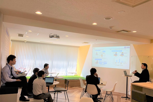 オープンスペースは大きな窓から日差しが差し込む気持ちの良い空間です。全社会議やお客様を招いたセミナー、ケータリングを用意した懇親会に使ったり、日常では社員のランチや休憩、ちょっとしたミーティングなど、使い方はとても自由。ひな壇型のベンチ、カフェテーブルに自由に座り、会話も弾むリラックス空間です。