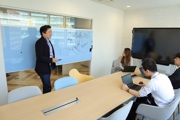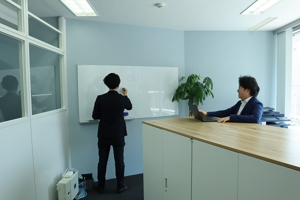 執務室内で、軽くディスカッションをしてホワイトボードでアイデアを整理たいときには窓際のスタンディングエリアへ。会議室で座って打ち合わせをするとどうしても長引いてしまうので、ミーティングを短時間で終わらせる効率アップのアイデアです。