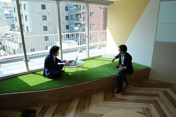 セミナールームの奥の緑のエリア、気になりましたか?そうなんです、芝生なんです。ちょっと遊び心で作ってみました。日向ぼっこには最適です。