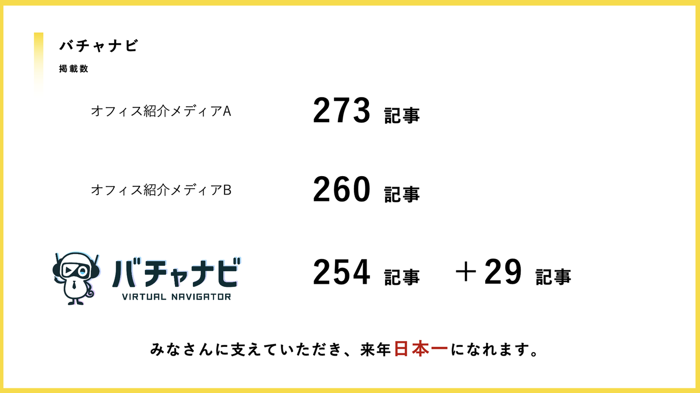 2023年に本格始動したバチャナビは、約一年間で日本一の記事数とPV数を誇るメディアになることが決まりました。(公開済み記事数254記事 + 公開予定記事29記事)同様のオフィス紹介メディアが5-10年以上運営されているもの対して、異例のスピードで成長することができました。この急成長を支えていただいたお客様や編集部のメンバーには感謝しかありません。