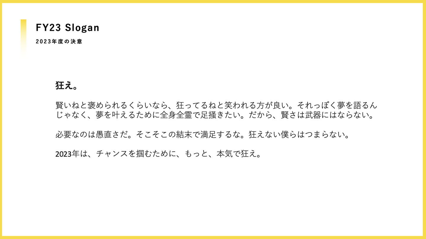 このスローガンのもと、一人ひとりが高いレベルの仕事をしてくれたおかげで、2023年はチャンスを掴むための種を生み出し、育てた一年にできたと思います。