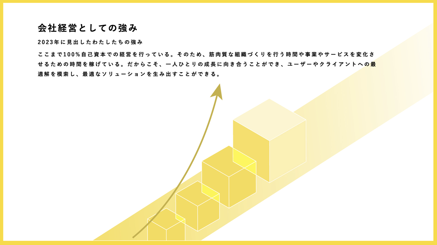 ここまで100%自己資本での経営を行っています。そのため、筋肉質な組織づくりを行う時間や事業やサービスを変化させるための時間を稼ぐことができました。時間があるからこそ、組織一人ひとりの成長に向き合うことができますし、ユーザーやクライアントへの最適解を模索し、最適なソリューションを生み出すことができました。