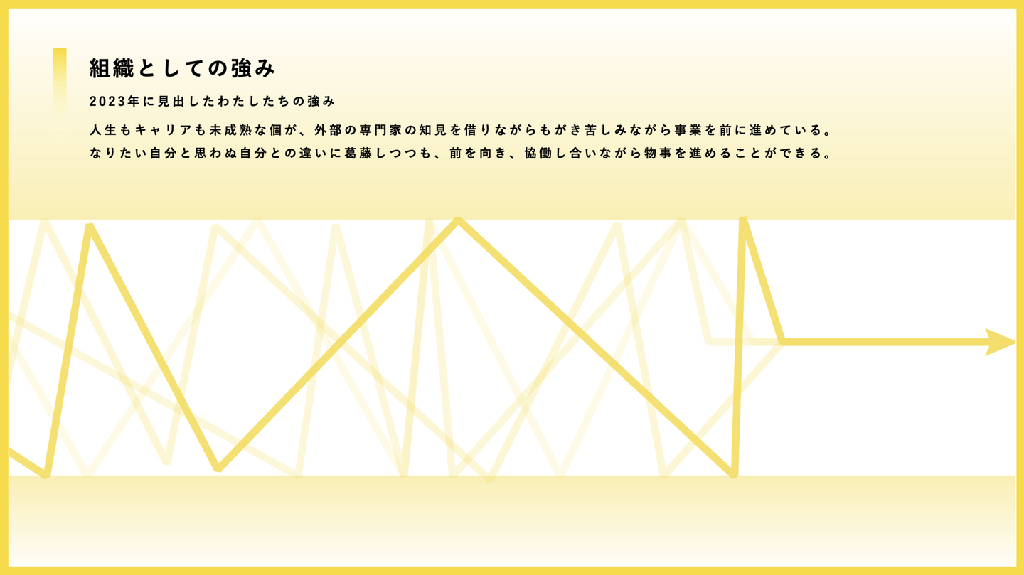 人生もキャリアも未成熟な個が、外部の専門家の知見を借りながらもがき苦しみながら事業を前に進めている組織です。なりたい自分と思わぬ自分との違いに葛藤しつつも、前を向き、協働し合いながら物事を進めることができることが組織的な強みです。