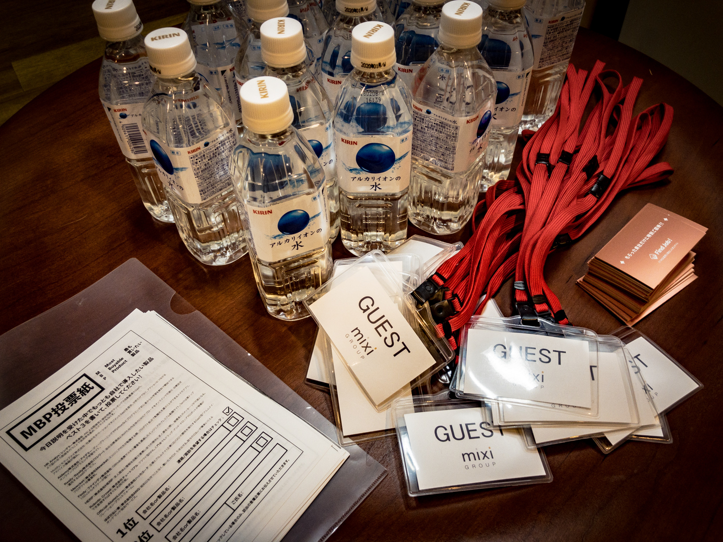 お水とMBP(もっとも買いたい/導入したいと思ったプロダクト)を選ぶための投票用紙とお水と会場を提供いただいたミクシィさんのFind job!の特別クーポンが配布されました(*゚▽゚*)