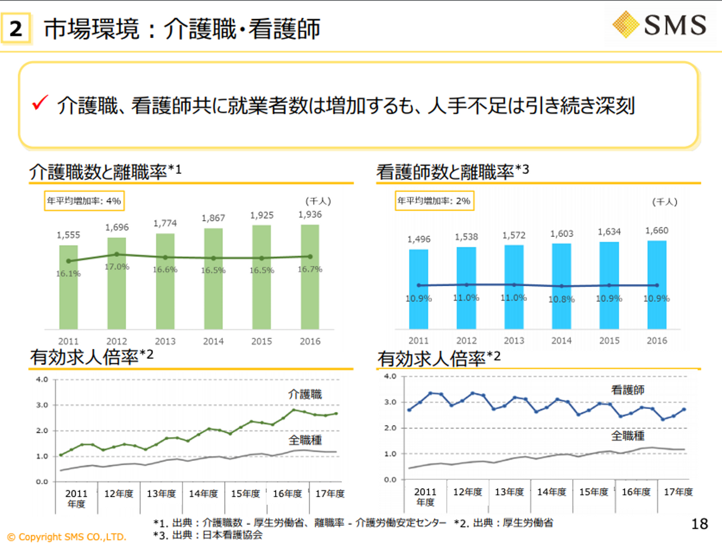 最後に、看護師市場の有効求人倍率を調べておきます。こちらは介護・医療・ヘルスケアなどの情報サービスを提供する株式会社SMSの決算説明会資料が参考になります。