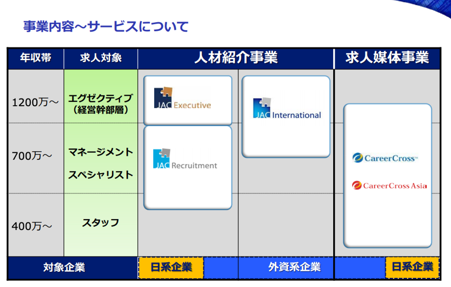ジェイエイシーリクルートメントは、割と年収が高い人を対象とした人材紹介事業を行なっていることがわかります。