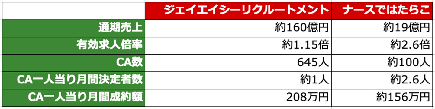 → 「ジェイエイシーリクルートメント」「ナースではたらこ」の事業数値を参考に、CA一人当り月間決定者数・・・(★)がどれくらい作れそうか?を考える