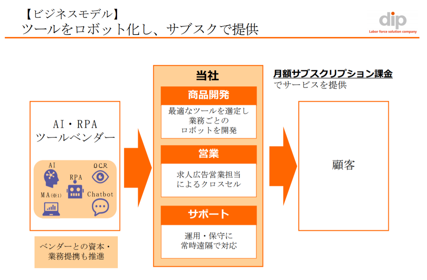 今、ディップで作っている新規事業というのが、人材派遣業界や飲食・小売業界を対象に月額サブスクリプション型でAI・RPAを活用したロボット(デジタルレイバー)を提供するビジネスを立ち上げています。