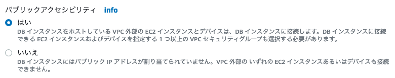 ついでに、パブリックアクセシビリティを【はい】に変更しCloudSQLから接続できる状態にします。