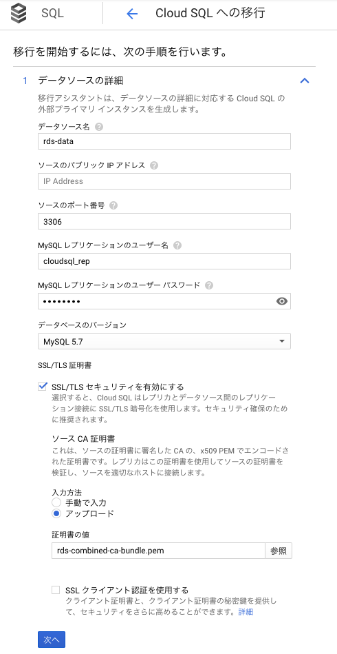 CloudSQLからデータ移行を選択します。 移行を開始を選択して入力が必要な部分を埋めていきます。