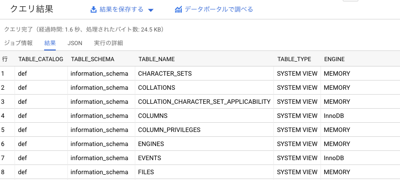 SELECT * FROM EXTERNAL_QUERY("プロジェクトID.ゾーン.CloudSQL_federated_query_RDS", "SELECT * FROM INFORMATION_SCHEMA.TABLES;");
