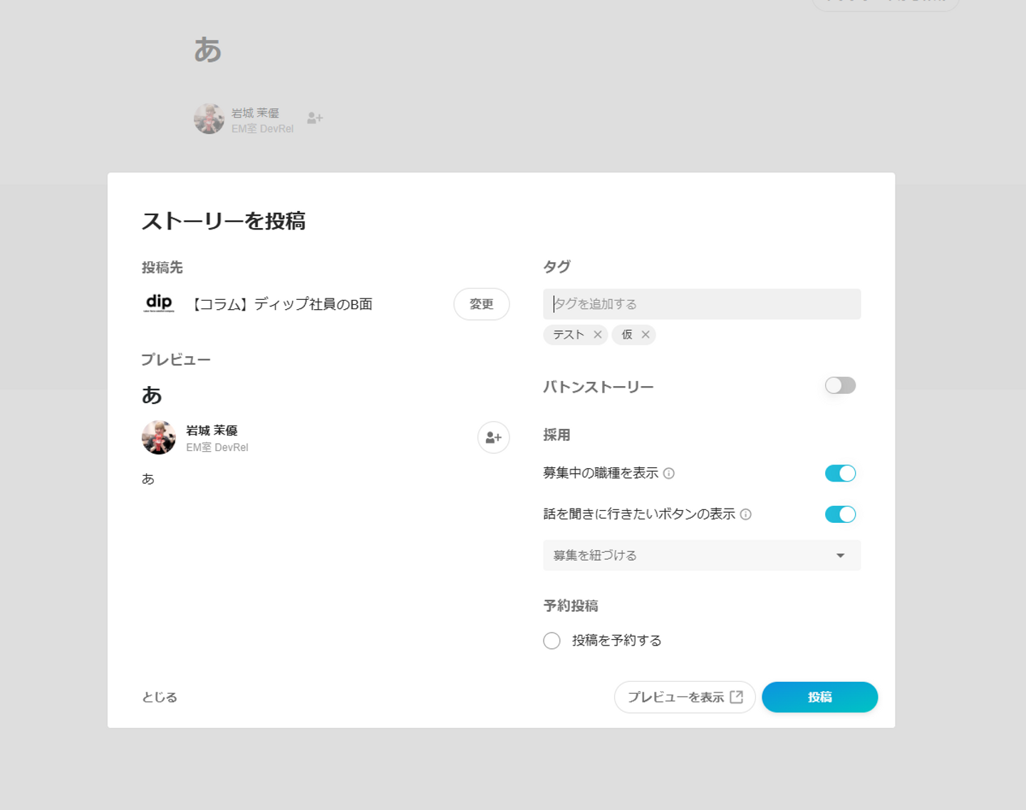 投稿先を【コラム】ディップ社員のB面に設定。