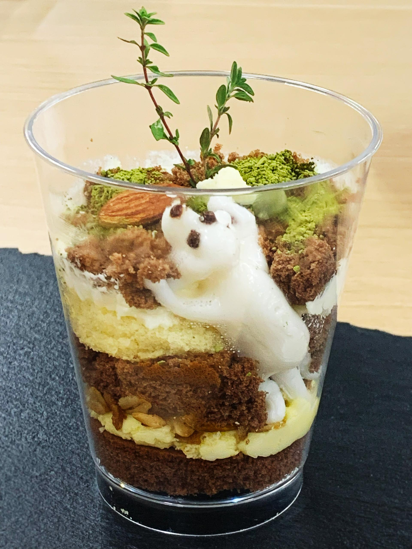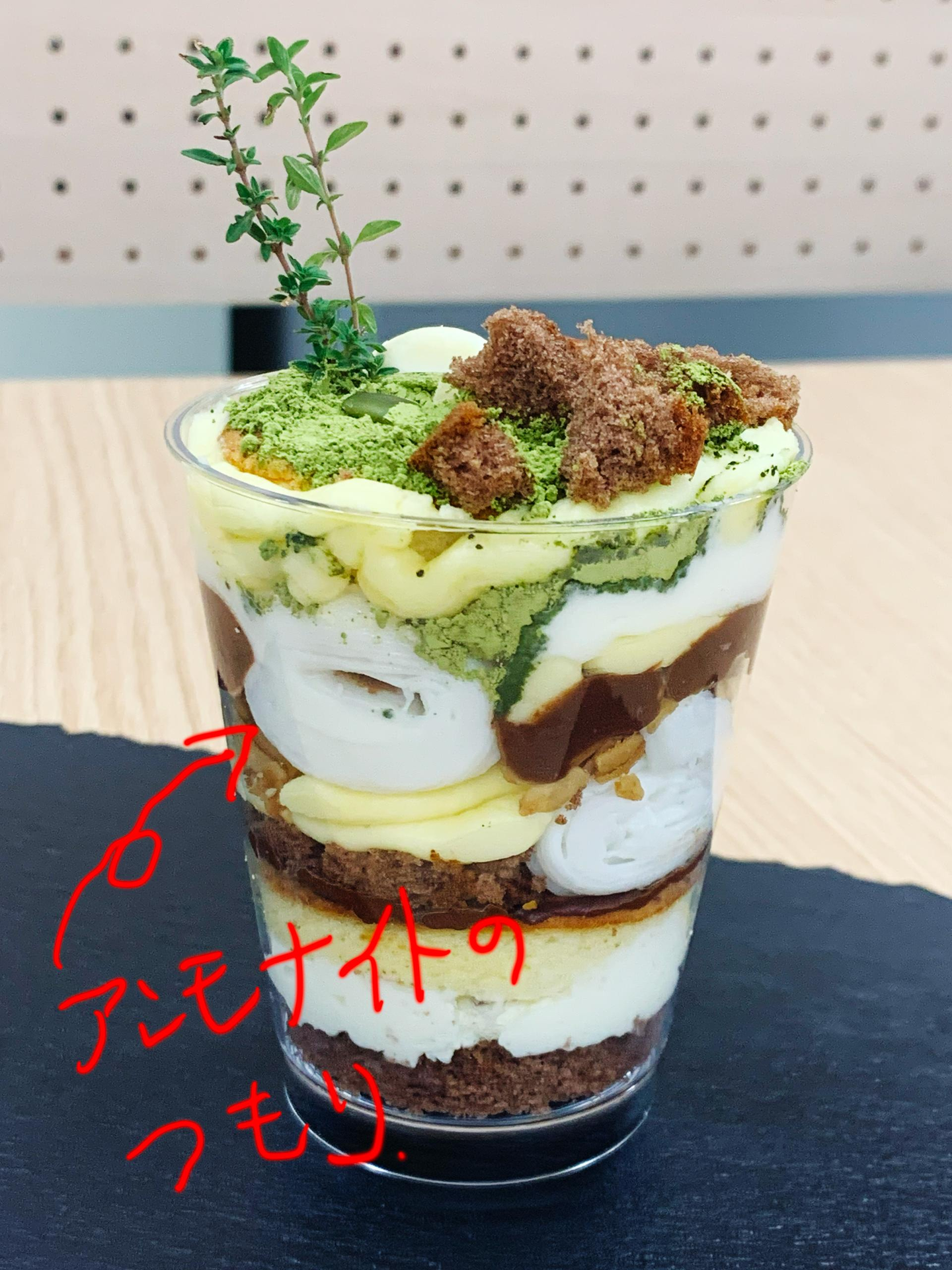 あらかじめ準備したスポンジやホイップクリーム、バタークリーム、グラノーラ、抹茶パウダーなど、好きなケーキの材料を透明の容器にスタックしていきます。”断面映え”を意識しましょう。