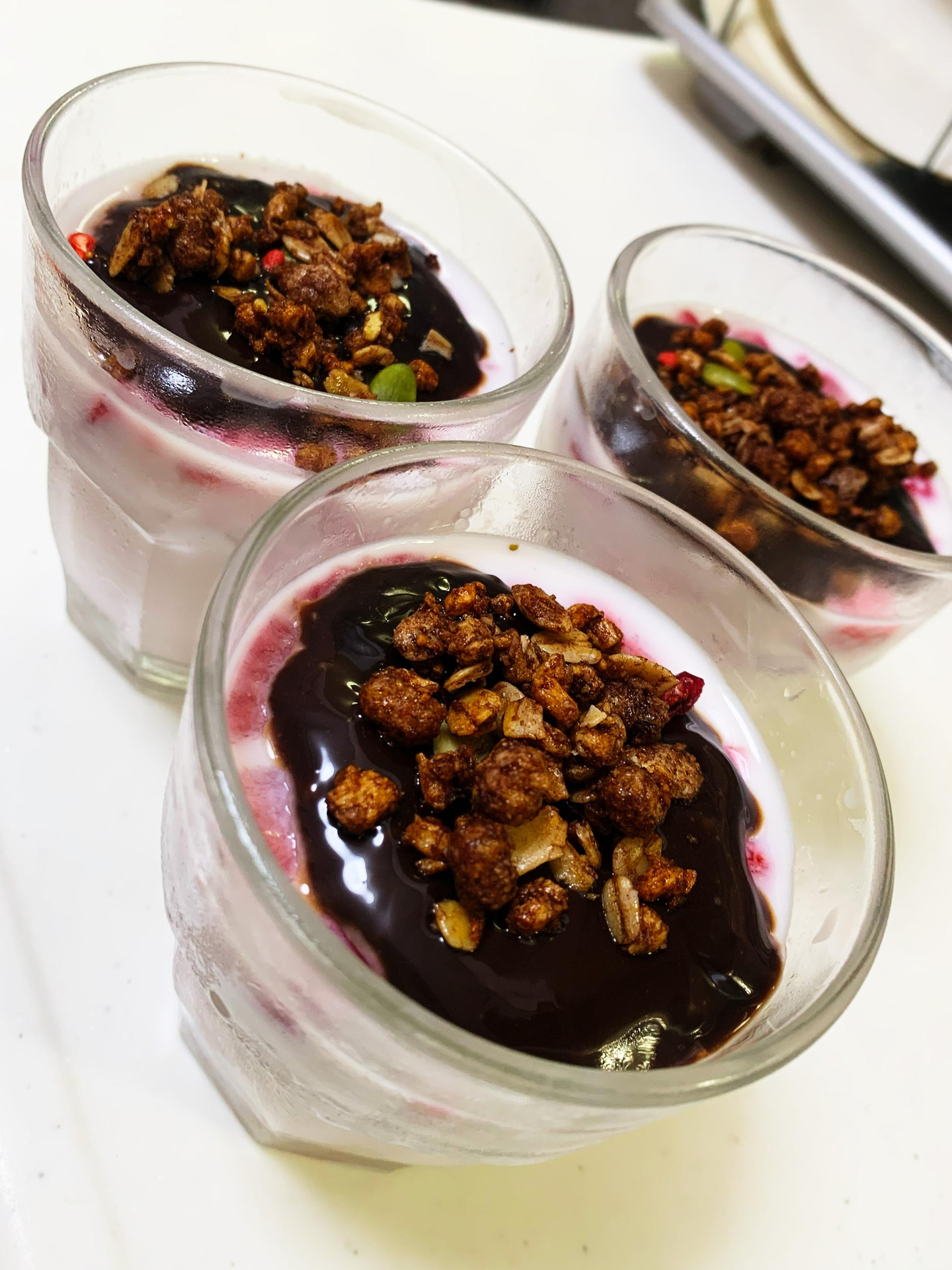 これだけでもおいしいですが、トッピングするとグッと見栄えが良くなるので、チョコソースとグラノーラーをのせてみました。サクサク食感を残すために食べる直前にやりましょう。