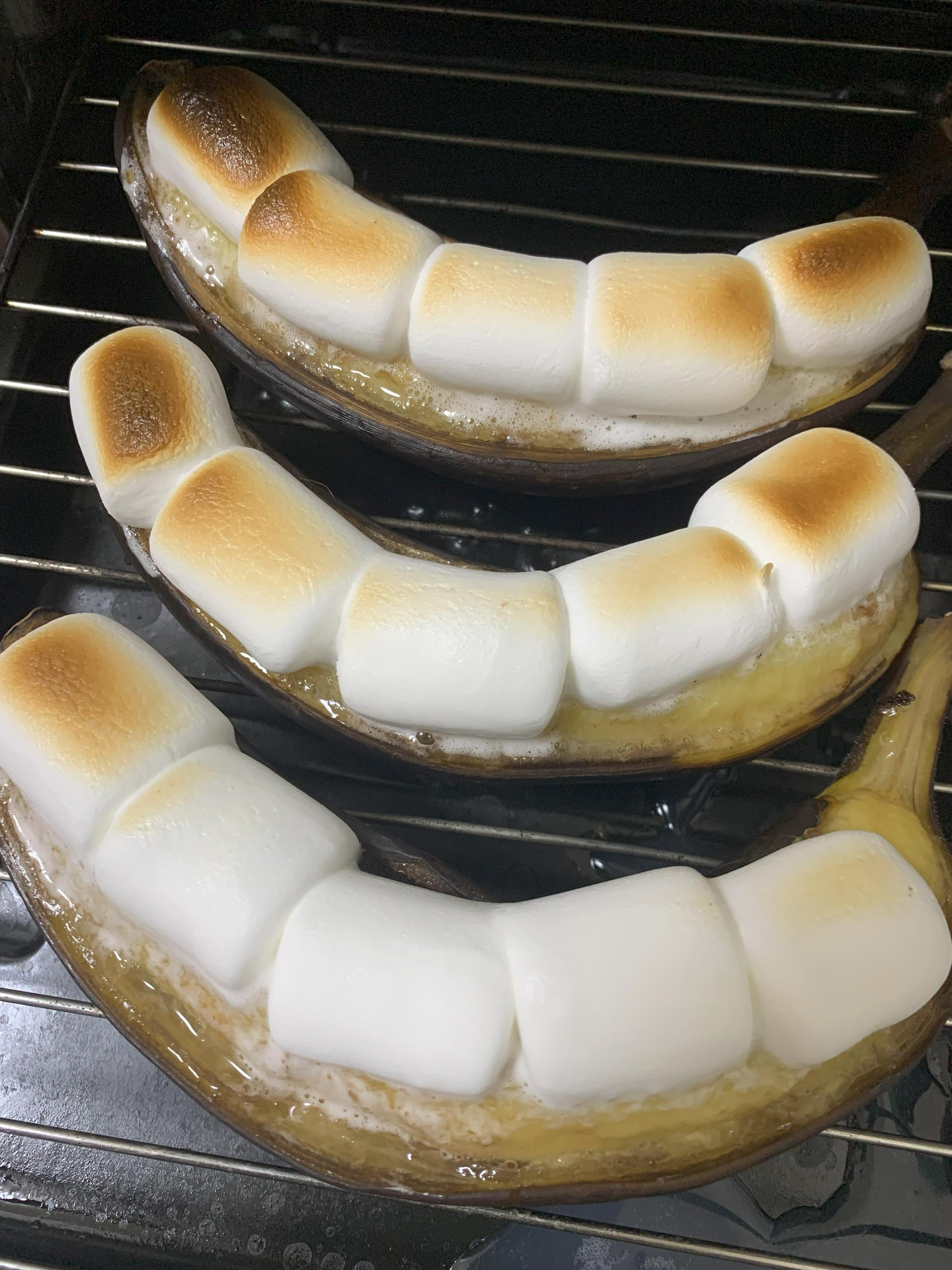 半分だけ皮をむき、カットしたマシュマロを並べて再び魚焼きグリルに投入。マシュマロにほどよく焦げ目がついたら出来上がり。