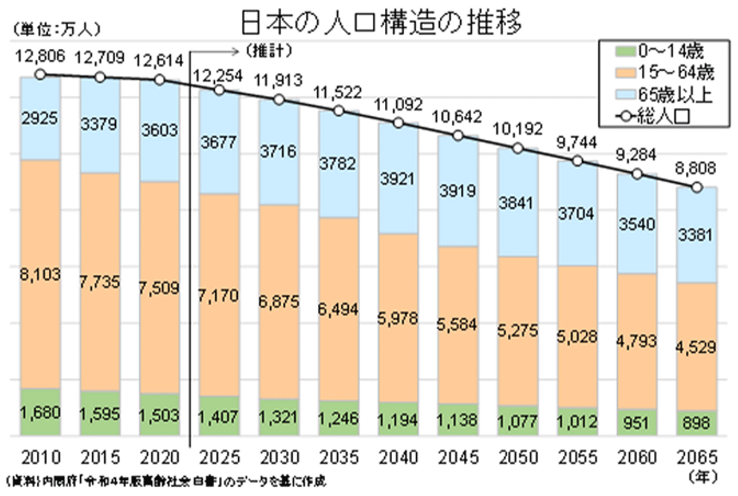 ニッセイ基礎研究所から出ているレポートでは、2010年以降の人口構造の推移と合わせてわかりやすく可視化されています。(https://www.nissay.co.jp/enjoy/keizai/157.htmlより転載)