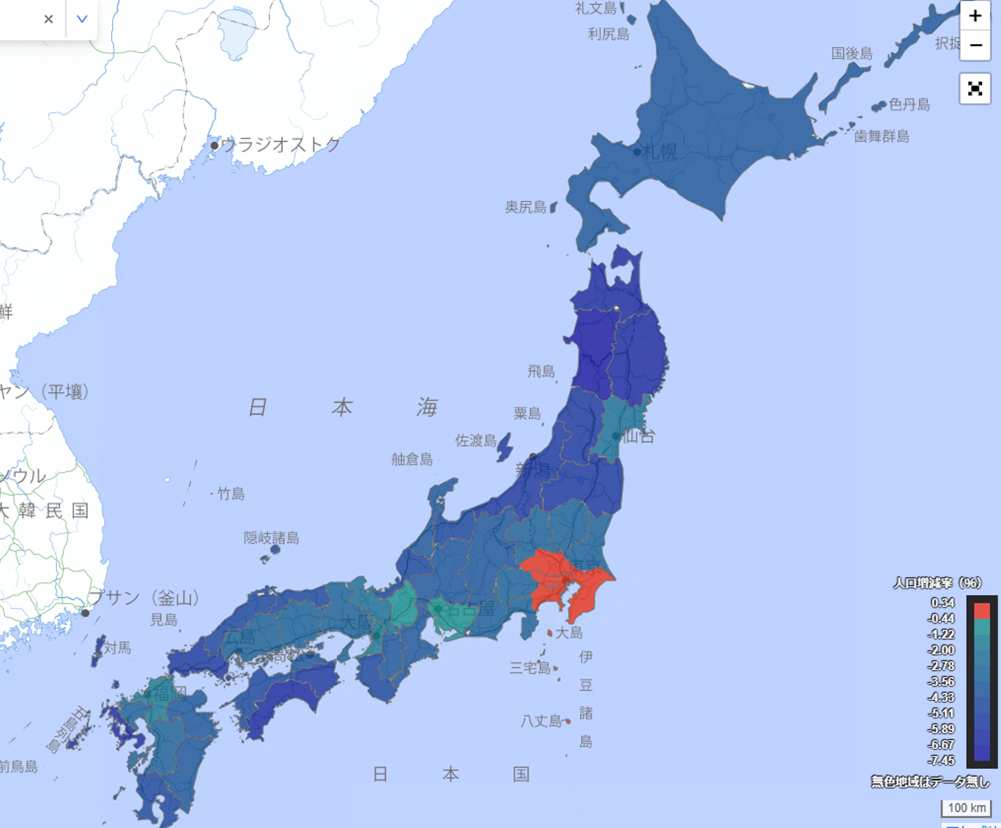 関東地方、東京、千葉、埼玉、神奈川以外は人口減少の都道府県になります。
