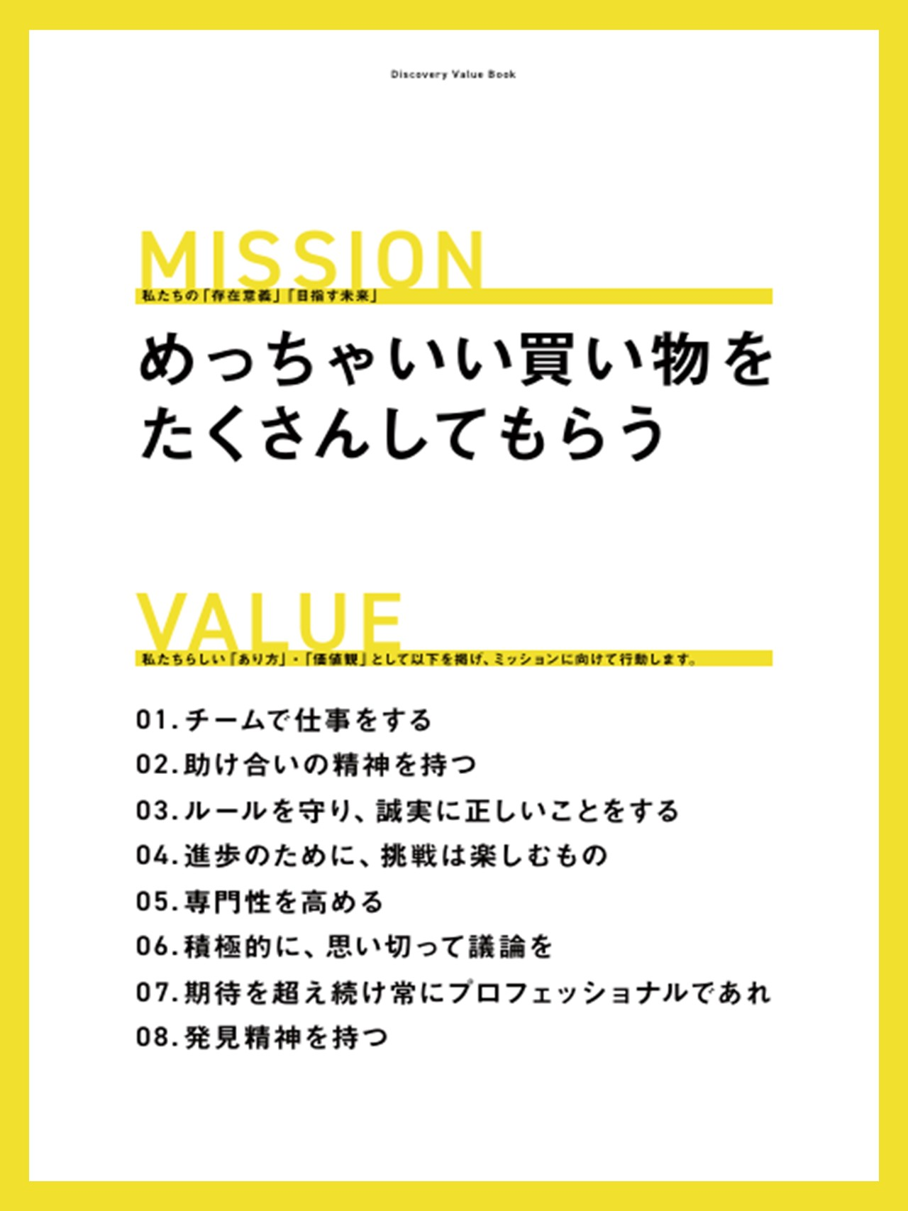 実はディスカバリーには《めっちゃいい買い物をたくさんしてもらう》という大事なミッションがあります。そして、そのミッションを達成するために、会社の「在り方」や「価値観」を表す《VALUE》というものを8つ掲げています!