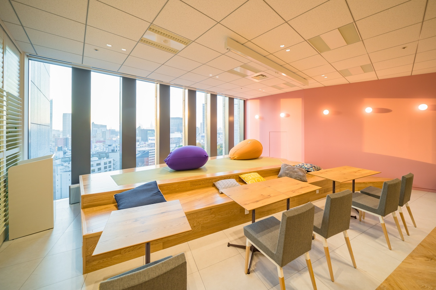 最後に「和み」の空間です。ビーズクッションなどを置くことで、文字通りリラックスできる空間にしています。出会い・交流を経てだんだんと打ち解けて、温かさに辿り着くことを感じてもらえるように壁はピンク色にしました。