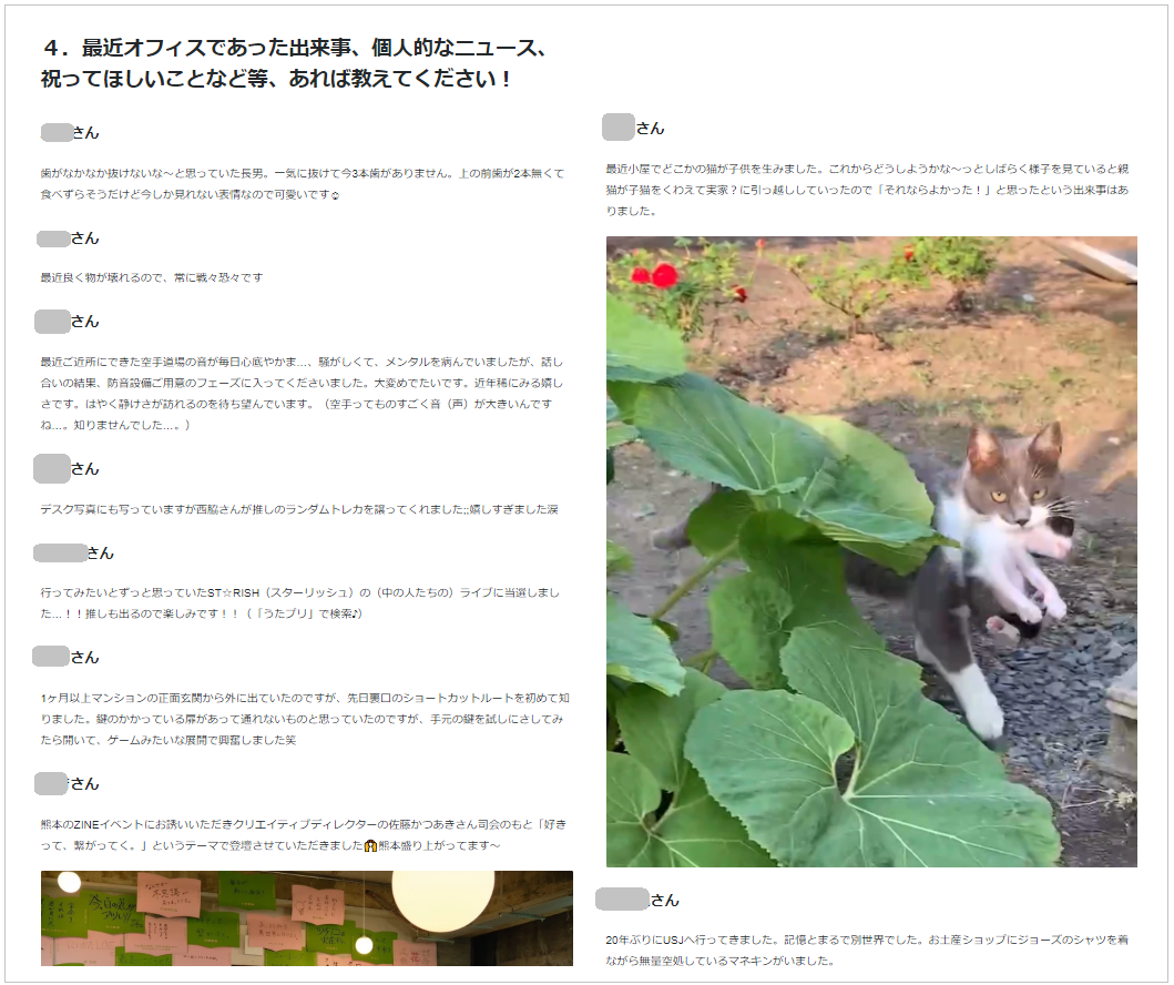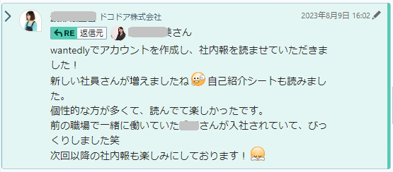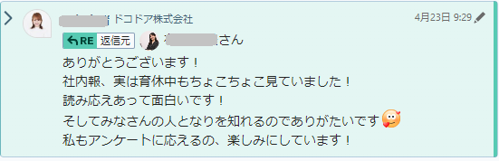 在職中のメンバーからは面談時に「◯◯さんの回答めちゃくちゃ面白かった笑」や「この企画また定期的にやってほしい!」などの感想をもらうことが多く、励みになります!また、産休・育休中のメンバーにもメールで配信されており、手が空いたときに見てくれているようで、たまに感想コメントをもらえます!復帰直前の不安払しょくにも活用できているのではと考えています!