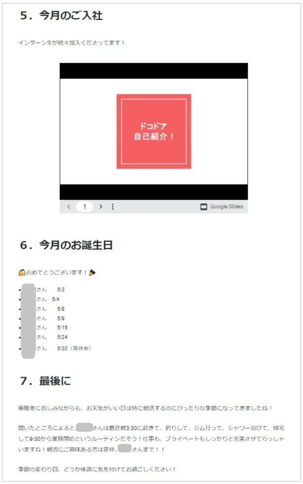 そして、最後に今月の入社・復帰、お誕生日をご紹介して、終了というふうな感じです!