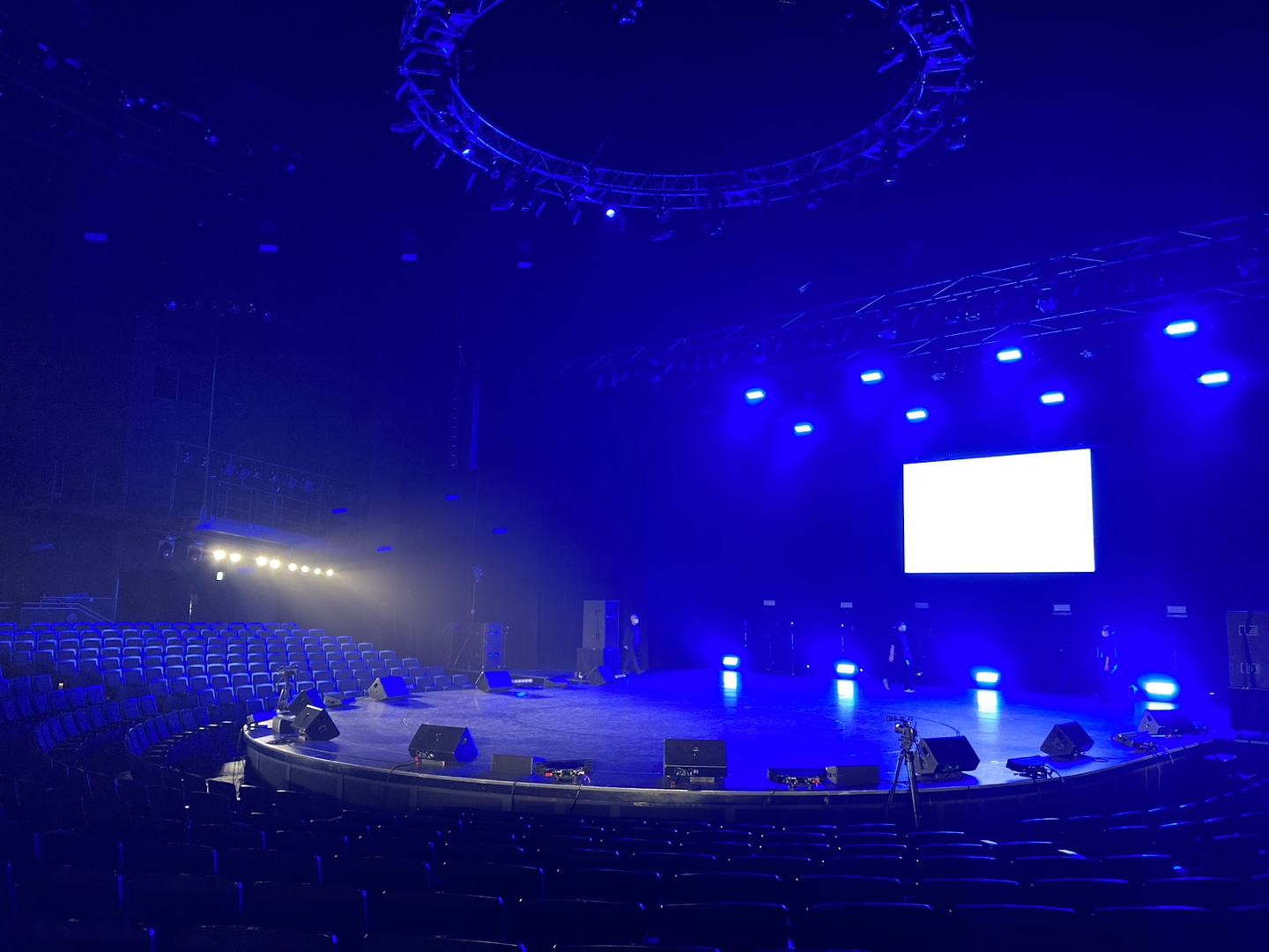 「NIG 2022」の会場となったのは「舞浜アンフィシアター」です。春も近づきあたたかな日差しに恵まれた3月10日の朝、会場へ向かう電車は近隣のテーマパーク等へ向かう人たちでいっぱいでしたが、舞浜アンフィシアターの熱気も負けてはいません。開場前のステージは、約2ヶ月間にわたるコンテストを勝ち上がってきた14組のファイナリストたちの希望と気合いに満ちていました。