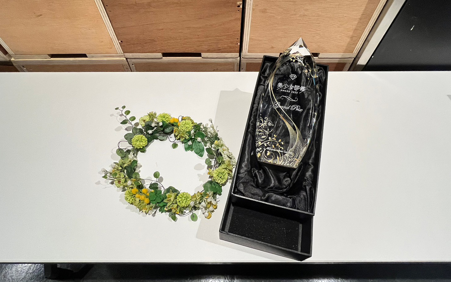 そして栄えあるグランプリに輝いたのは、すらりとした手足を活かし、モデル部門で颯爽とランウェイを歩いた佐々木 満音(ささき みろん/広島県在住、12歳)さん!テーマでもある「芽生え・芽吹き」を意識した鮮やかなグリーンが映えるティアラと、ずっしりと重みのあるガラスのトロフィーが授与されます。受賞の気持ちを聞かれると、緊張した表情から飛び出した「最高でーす!」の一言に会場がどっと沸きました。