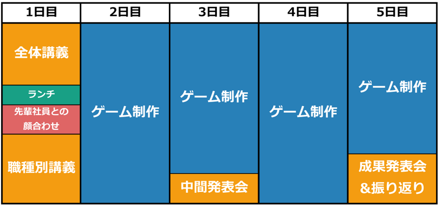 今年度はエンジニア・デザイナーの社員主導のもとカリキュラムを組み、昨年度よりも実践的な内容にしました。5日間にわたる研修は、1日目に全体講義、2日目から5日目まではゲーム制作というスケジュールになっており、講義で聞いた内容をすぐに実践する、密度の濃いカリキュラムが組まれました。