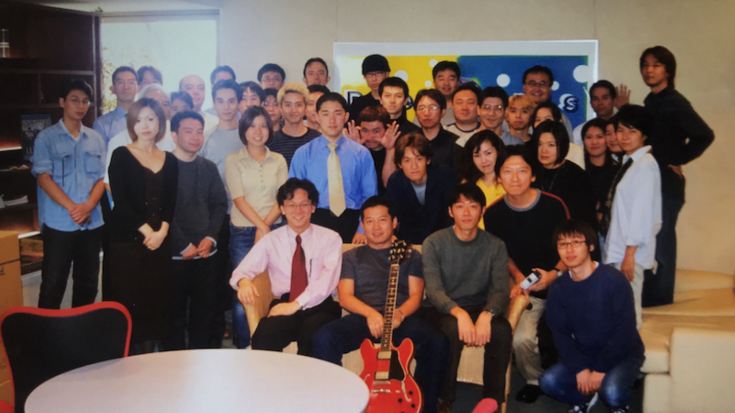 ▲牧山入社当時のドリーム・アーツ集合写真(2000年ごろ、牧山は前列中央右)